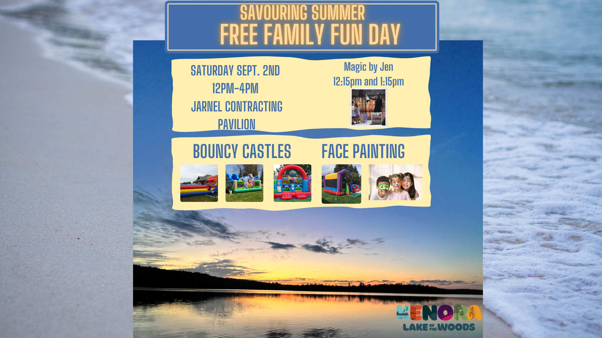 Tourism Kenora invites you to Savour the last days of summer with a FREE family fun day at the Jarnel Contracting Pavilion on Saturday September 2nd from 12:00pm to 4:00pm. The event will feature bouncy castles, face painting and two Magic by Jen...