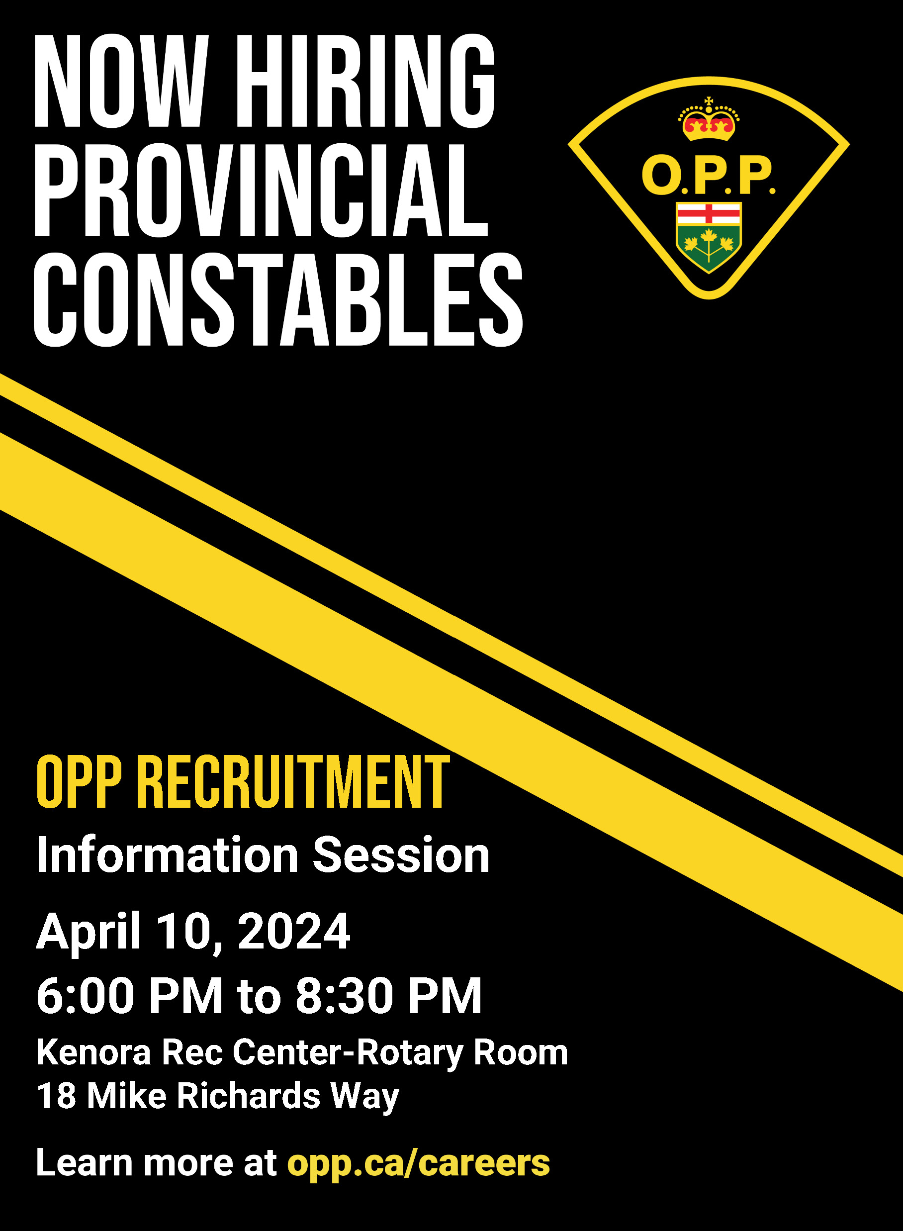 The Kenora OPP will be hosting a recruitment information session in the City of Kenora on April 10, 2024, from 6:00 p.m., to 8:30 p.m. at the Moncrief Construction Sports Centre, in the Rotary Room.