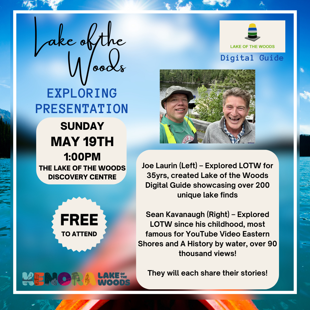Tourism Kenora invites you to the Exploring Lake of the Woods Presentation on Sunday, May 19th at 1pm at The Lake of the Woods Discovery Centre. This free event is hosted by Joe Laurin and Sean Kavanaugh.