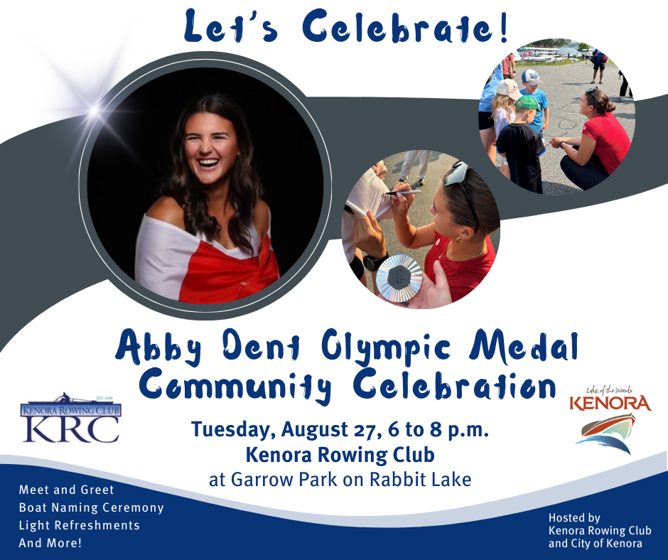 The City and Kenora Rowing Club invite the community to join them in commemorating Olympic Silver Medalist, Abby Dent, at a special community event scheduled for Tuesday, August 27 from 6 p.m. to 8 p.m. at the Kenora Rowing Club, located at 110 Birchwood Crescent in Garrow Park.