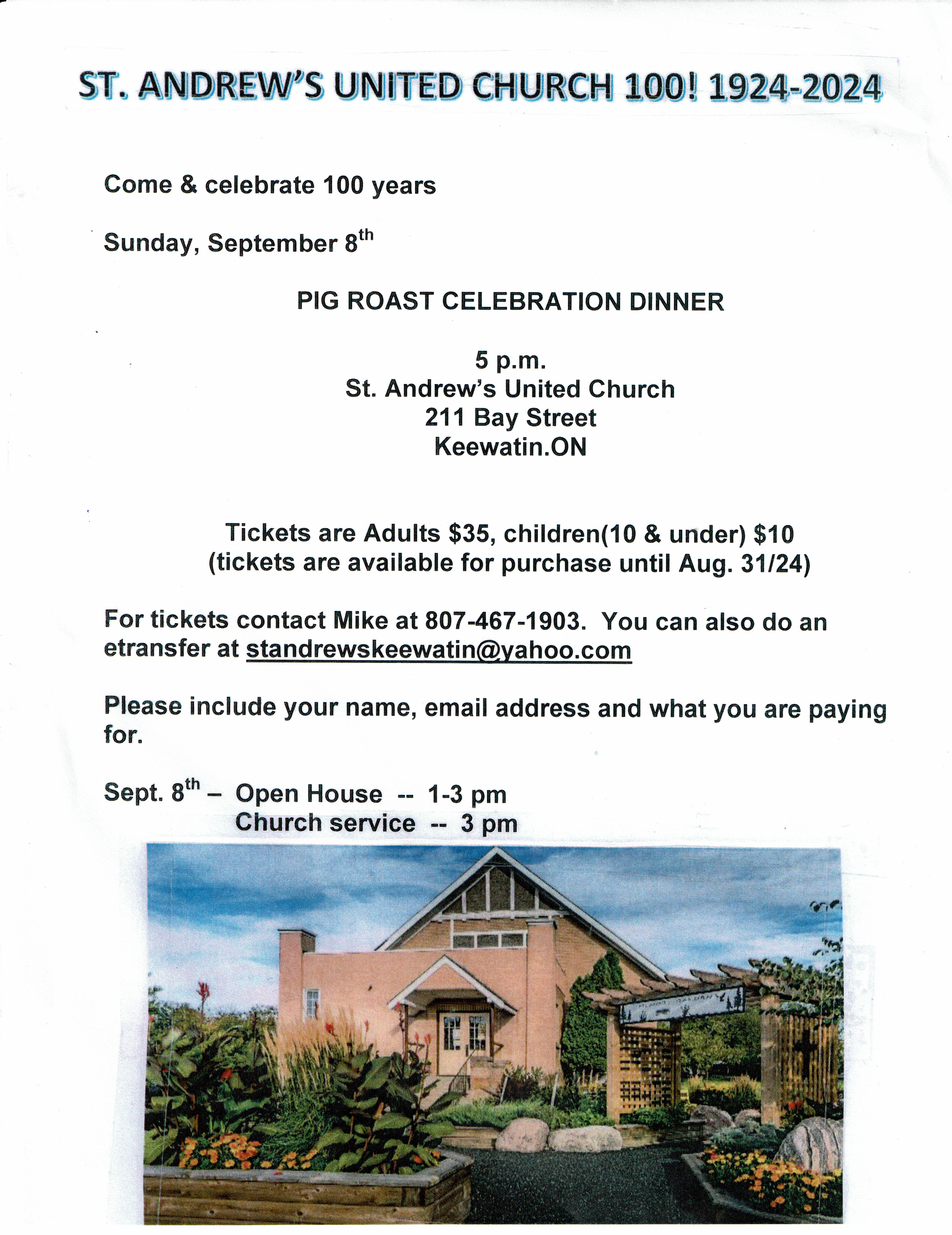 Then at 5 pm there will be a Pig Roast Dinner celebration. Tickets are required to attend the dinner. Cost is $35 for Adults and $10 for children 10 and under. Tickets may be purchased either by contacting Mike Aiken at 807-467-1903 or by e-transfer at standrewskeewatin@yahoo.com. When using e-transfer include in the message area you name, email and tickets you are paying for.