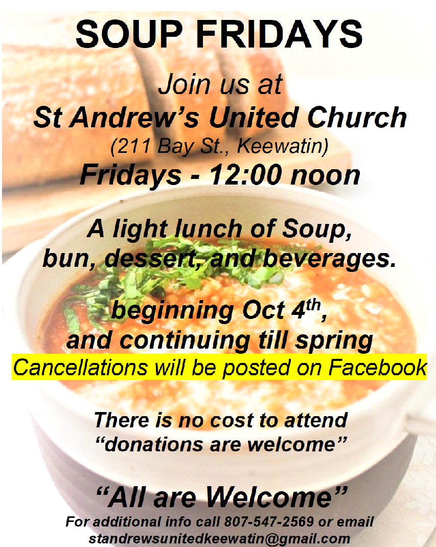 St Andrews United Church invites you to join us on Fridays for a light lunch of soup, buns, dessert and beverages. We gather around 12 noon and enjoy a hot meal while visiting with other members of our community.